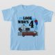 En poliskryssare, en brandmotor, ballonger och text som lyder "Se vem som är 4" finns med på vår vardagliga Heroes 4e födelsedagen-design.