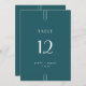 This simple art deco wedding table number from the Everly Collection features a deep teal background, refined parisian typography, and delicate white line accents. It's modern, minimalist, and perfect for retro-inspired weddings.
