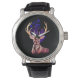 en dekorativ ondskans teckning tittar ett gigantiskt utseende av ett lager med en mäktig antler som en dekorativ handklocka