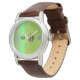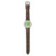 eWatch Watch har ett brunarmband, grönt metallic ansikte med honungsbin Ljud Vågar och Blommor vid 12-3-6-9.