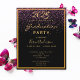 En modern och stilren inbjudan till en 2026 års examensfest. Glamourös med elegant och modern svart bakgrund och lila konfetti regn. Med en falsk guldram. Mall för namn och festdetaljer. Texten Examen och namnet är skrivna med modern handskriven stil. Gyllene bokstäver.