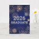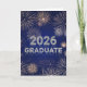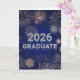 En collage av svärmande fyrverkerier som exploderar mot en djup, firande blå bakgrund och lyser upp en skimrande "2026 Graduate"-text.