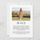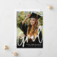Enkel minimalistisk examensannonskort. Framsidan har ett helsidesfoto med en svart gradient längst ner, överlagt med vit text för en snygg och modern look. "Grad" visas i elegant handskriven skrift, med examenens namn, "Klass 2026" och skolans namn nedan i klassiska vita teckensnitt, vilket säkerställer en djärv och läslig design.