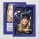 Ett blått och vitt anpassningsbart tillkännagivande för en examen från gymnasiet eller universitetet. Det finns två utrymmen för foton. Anpassa med examensdatum, skolans namn, studentens namn och en notis om deras planer efter examen.