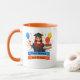 Den här lekfulla designen visar en ung tjej som har tagit examen iförd sin mortarboardhatt med tofs, stolt hållande sitt examensbevis i ena handen och en födelsedagstårta med brinnande ljus i den andra – för varför välja bara en fest? Festliga ballonger och färgglatt konfetti tillför extra glädje runt omkring.