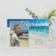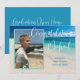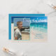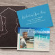 Utkast till examen med foto och anpassad text. Lägg till ett vertikalt foto längst fram över en bakgrundsbild av en tropisk strand. Stor vit skrivstil "Grattis Namn". Lägg till mer text för skolans namn och avgångsklass. På baksidan kan du anpassa firandet med vit text över havsblå färg. Ändra och ta bort text efter behov.