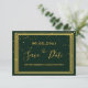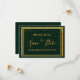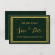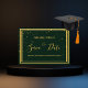 En Spara datum-kort för en examensfest. Emeraldgrön bakgrund dekorerad med gyllene konfetti och en falsk guldram. Anpassa och lägg till datum och namn. Gyllene bokstäver. Texten: Spara datum är skriven med en stor trendig handskriven scriptstil.