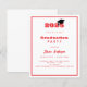 En modern och stilren inbjudan till examenfirande. Både för honom och henne. Vit bakgrund, röd text och en ram. En svart examensmössa.