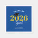 Dessa blå personliga pappersservetter är en perfekt accent för alla examensfester. Den guldfärgade och vita texten lyder: Examenklass 2026. En svart studentmössa sitter ovanpå nollan i årtalet.