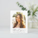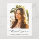 Modern examens tacksamhetskort vykort med examenkandidatens foto i en modern välvd bildram, "tack" i ett elegant skrivstil och deras namn och examensår i enkel typografi. På baksidan kan du anpassa ett tackmeddelande och lägga till deras namn i en signaturliknande skrivstil.