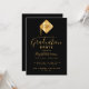 En elegant, enkel inbjudningskort för en examensfest för både han och hon. En svart bakgrund och en modern svart abstrakt tofs toppdel i falskt guld med året inuti. Mall för namn och festdetaljer. Texten Examen och namnet är skrivna med modern handskriven stil. Guld färgad text.