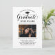 Inbjudan till examensfest med modernt manus “Examinerad”, en ikon för mössa och en ren fotoutformning. Minimal styling fungerar för alla skolans färger. Skiffergrå bakre kort visas för en neutral, modern accent. Anpassa examenets namn och alla festsdetaljer.