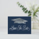 Elegant grå och silvertonad akvarell examenshatt och text accentuerad med blå bakgrund. Underbar spara datum-kort att skicka till familj och vänner för att meddela att det kommer att bli en examen eller fest. Modern för dagens studenter.