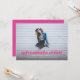 Denna examensannonsering och inbjudan med bild över hela ytan har orden "äventyr väntar" i varmrosa. Det finns utrymme för din examenstudents detaljer på framsidan och ännu mer utrymme för text på baksidan av kortet.