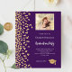 En modern, elegant inbjudan till examensfirande. En lila bakgrund dekorerad med falskt guldkonfetti. Anpassa och lägg till foto, namn och festdetaljer. Vit text.
