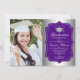Inbjudan till examensfirande med ditt foto. Funktioner skrifttyp, tofs och konfetti. Elegant lila design med falskt glitter silver. Perfekt för en elegant fest.