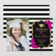 Inbjudan till examensfirande med ditt foto. Funktioner svart vita ränder, skrivstil, varmgula rosor, tofs och konfetti. Elegant svart vit fuksia design med falskt glitterguld. Perfekt för en elegant fest.