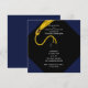Unik inbjudan till examensfest med klassisk svart och guld mössa på en navyblå bakgrund.