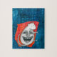 En penna ritad med en ansikte på ryggen, över orangen och blå akryl.