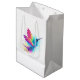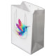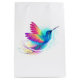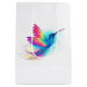 Ljusstark, iriserande, exotisk flygande hummingbird på vit bakgrund, målad med multifärgad, vattenfärg. Regnbågsmusfågel.