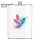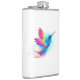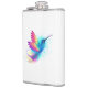 Ljusstark, iriserande, exotisk flygande hummingbird på vit bakgrund, målad med multifärgad, vattenfärg. Regnbågsmusfågel.