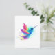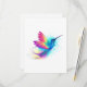 Ljusstark, iriserande, exotisk flygande hummingbird på vit bakgrund, målad med multifärgad, vattenfärg. Regnbågsmusfågel.