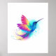 Ljusstark, iriserande, exotisk flygande hummingbird på vit bakgrund, målad med multifärgad, vattenfärg. Regnbågsmusfågel.
