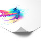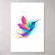 Ljusstark, iriserande, exotisk flygande hummingbird på vit bakgrund, målad med multifärgad, vattenfärg. Regnbågsmusfågel.