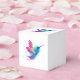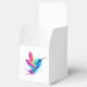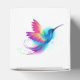 Ljusstark, iriserande, exotisk flygande hummingbird på vit bakgrund, målad med multifärgad, vattenfärg. Regnbågsmusfågel.