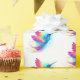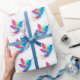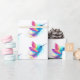 Ljusstark, iriserande, exotisk flygande hummingbird på vit bakgrund, målad med multifärgad, vattenfärg. Regnbågsmusfågel.
