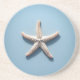 A picture of an orange starfish with a blue background. Bright white light seems to shine upon it.