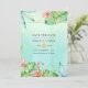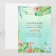 Sommar-bröllop spara datum-kort med rikligt tropiskt grönt, strelitzia, hibiscus, en flamingo och ett guld-geometriskt ram.