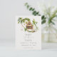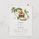 Detta vykort från bröllop spara datum är en tropiskt djungelmönster med naturens färg. Den har handflatan träd, lustiga regnskogar och bungalows inneslutna i ett vackert tropiskt paradis.