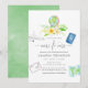 Sagegröna och vita botaniska tropiska frangipanis resa tema bröllopsinbjudningskort designade för att snabbt och enkelt anpassas till din evenemangspecifikationer.