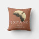 "Expandera dina vågor" är ofta det bästa sättet att komma igång och flyttan framåt. Det kan också leda till att underbara möjligheter och möjligheter upptäcks i ditt liv och i ditt eget. På ena sidan av kudden visas detta uppmuntrande, inspirerande budskap med ljusbokstäver på en rost orange som bakgrund för en sepialiknande abstrakt utformning i mörk brun, blek gult och brun. Å andra sidan formgivningen utan ord, även med orange av rost.