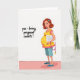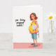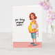This card shows a cheerful expecting woman with long auburn hair and bright blue eyes standing slightly to the right, her rounded belly highlighted as she gives it a tender, affectionate touch ❤️. She wears a sunny yellow tunic with small white dots and a pink trim, paired with calm blue capri pants and matching casual shoes. In her other arm she holds a white sheet of paper, and a pink measuring tape hangs down from it, adding a gentle, everyday detail that feels caring and close. On the left side, the phrase “yes - being pregnant counts!” appears in casual hand-drawn lettering, set in dark ink for strong contrast. The text sits about mid-height and is spaced to balance the figure, leaving plenty of open room around it. The background is simple, with white across the top and a warm blush tone along the bottom, like a soft floor line 🌼. A small gray shadow rests beneath her feet, anchoring her stance against the two-tone backdrop.