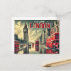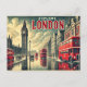 Här är vykortet i vintage resor som visar London med Big Ben som kör över en regnig gata. 🇬 🇧 ☔ I scenen ingår ikonröd dubbla-decker buss som kör längs blöten, deras reflektioner som syns i puddlarna. Bakgrunden visar klassisk Londonarkitektur med ornerade fasader, medan den grumliga himmel har en mjuk ljusglöd som går igenom. Den djärva Art Deco-stil-typografin lyder "Utforska London" och skapar ett nostalgiskt, europeiskt resesvib.