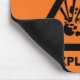 Orange mousepad med ett svart sprängmedelfarasymbol.