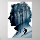 Upplev en slående blandning av bergsmajestät och spännande verkan i denna unika exponering för dubbla porträtt. En man, som bär en ullhatt, har sitt huvud och sin profil som konstlat sammanfogats med stora berg och träd täckt av snö, medan hans skinn och framsidan av hans ansikte fortfarande är tydligt synliga. I en fängslande detalj, precis under hans jawline, fångas en dynamisk figur av en man och hoppar över en brant, snöslang. I den här teckningen förenas på ett enastående sätt alpredskapens serengrandeur med den upplivande energin hos vintersporterna, och man skapar en övertygande berättarröst för äventyr och anslutning till topparna. Perfekt för älskare av bergstrakter, skidentusiaster eller någon som uppskattar nyskapande konst med flera skikt.