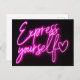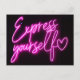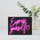 Lyft upp någons brevlåda med det här pulserande och inspirerande vykortet! Med det djärva, glödande utseendet på en shock rosa-nyans skickar det här kortet ett kraftfullt budskap till "Express you". Chicen, handskrivet skript och en charmerande hjärtedetalj dyker upp mot en djup svart bakgrund och skapar en fantastisk biet av mini-art. Oavsett om du skickar en uppmuntrande not till en vän, firar en milstolpe eller bara vill några positiva bilder, är det här vykortet perfektens val. Det dubblor också som ett fantastiskt mini-print att fästa på en inspirationstavla, band till ett spegel eller visning på ett skrivbord för att en daglig påminnelse ska vara opassande för dig. Design: Realistiskt shock rosa, riteffekt Meddelande: "Express you ♡" Mångsidig: Perfekt för e-post eller för använda som personlig dekoration. Tillbaka: Tom för personligen. Skicka ett meddelande som verkligen lyser. Beställ din i dag!
