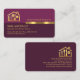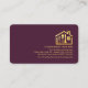 Overleaf, in a dark purple cover, card details are over on the right. At the top is the gold logo followed by the business name, its contact details and a slogan caption option. All lettering are in faux gold.