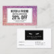 Koordinerar med Eyelash med Business Card-mallen Lila/Rosa Glitter senast 1 201.00. Uppdatera befordringstexten för det erbjudande du vill erbjuda. Skapa mer försäljning och besök genom att uppmuntra dina kunder att vända sig till sina vänner för en rabatterad tjänst eller kostnadsfri produkt. Underbar för lash-förlängningssalonger, lash pub, makeup artists m.fl. © 1201AM-KREATIV