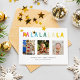 "Fa la la la" i sött, färglöst pastelltypsnitt, har 3 fotokollage julmagnetkort.