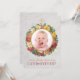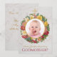 Faddersförslag för en flickas dop Det har ett platshållar-foto av en babyflicka i en vildrosenkrans med ett guldkors ovanpå.