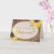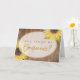 På en träliknande bakgrund finns en vit genomskinlig oval med förgylld ram med text i. Det finns två stora solrosor i hörnen, en ovanför och en nedanför den genomskinliga ovalen.