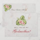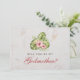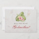 Denna eleganta "Vill du vara min fadder" förfrågningskort har en marmorerad bakgrund och en tropisk blomsterarrangemang av rosa hawaiiansk hibiskus (kinesisk ros), monstera och palmkvistar och mindre vita blommor. Blomsterarrangemanget är i mitten, ovanför texten, på framsidan och i två av hörnen på baksidan. Ordet "fadder" är skrivet med en burgunderröd elegant kalligrafisk stil. Meddelandet på baksidan är skrivet med samma stil, men i svart.