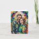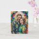 Vattenfärgsporträtt av en leende man och kvinna som står tätt intill varandra, båda iförda lediga skjortor med knappar. Bakgrunden visar en livfull explosion av abstrakta färger, inklusive livfulla nyanser av lila, turkos, orange, gul och rosa. De uttrycksfulla penseldragen och stänkeffekterna skapar en dynamisk, glädjefylld atmosfär runt de centrala figurerna.