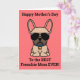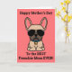 Franskbulldoggar, visa din mamma lite kärlek på mors dag med ett personligt kort bara från dig. Meddelandet på framsidan av kortet lyder “Lycklig mors dag till den bästa franskbulldoggsmamman någonsin!" Meddelandet inuti kortet lyder “Jag älskar dig mer än promenader, Lycklig mors dag.” Designen visar en söt, tecknad illustration av en hanne med rådjursfärgad fransk bulldog som bär en blå halskrage och svarta pilotglasögon. Typsnitt och bakgrundsfärg kan ändras genom att välja “Klicka för att anpassa ytterligare.”