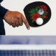 Fågel på en röd bukett pingisracket