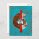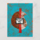 Rolig fågelillustration över en brun och beige klistrad form med orange rand nerför mitten - allt över en turkos och orange texturerad bakgrund.